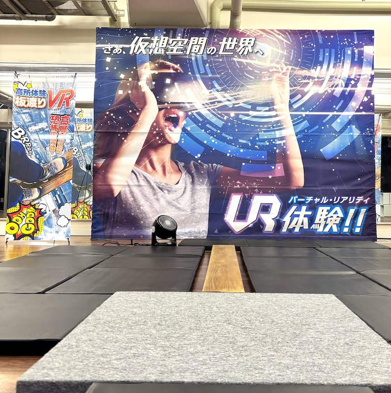「どこでもVRパーク」の出張VR体験会は、VR機材のレンタルはもちろん、イベントをPRする大型背面パネルやVRコンテンツ紹介パネル、体験者が見ている景色を映し出すTVモニター、Wifi機器など、